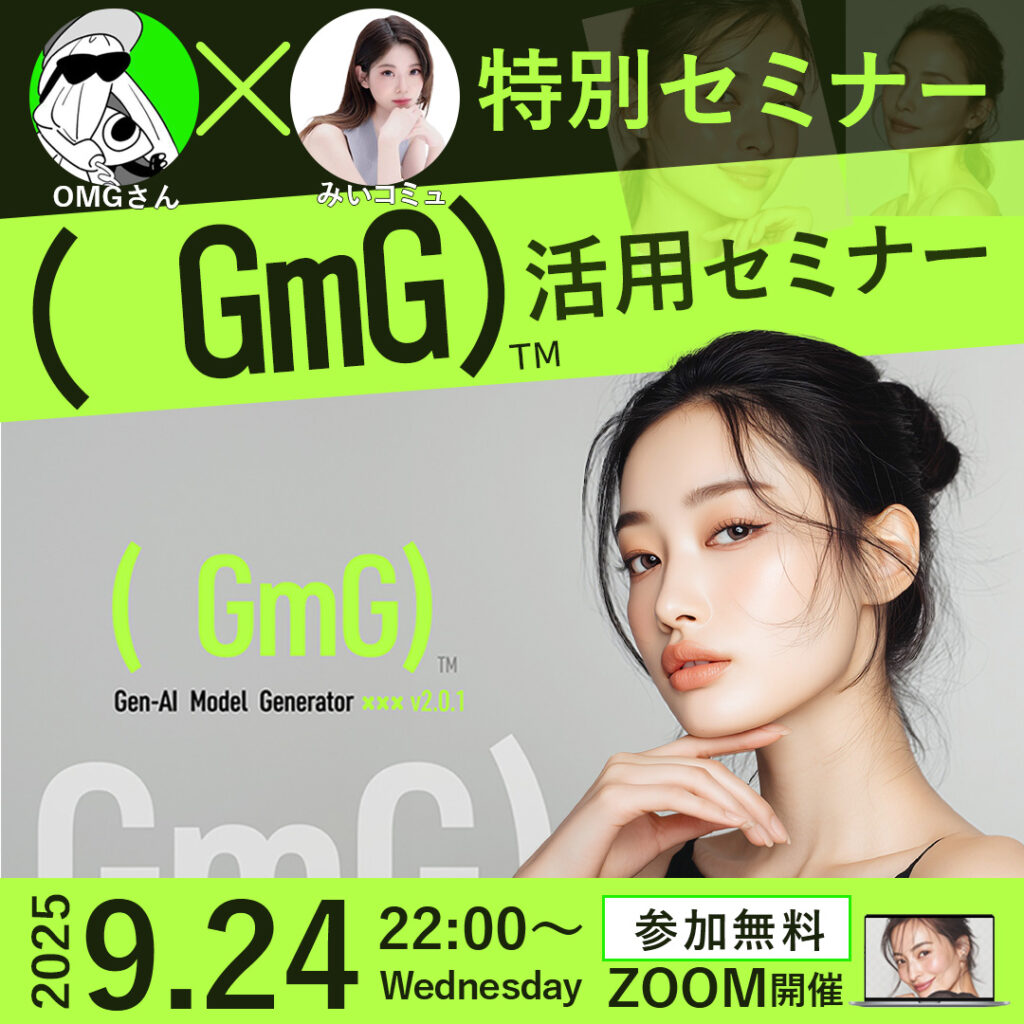 AIツール「GmG」の活用セミナーを訴求するため、目を引きやすいネオングリーンをメインカラーに使用し、AI・デジタル感を表現しました。