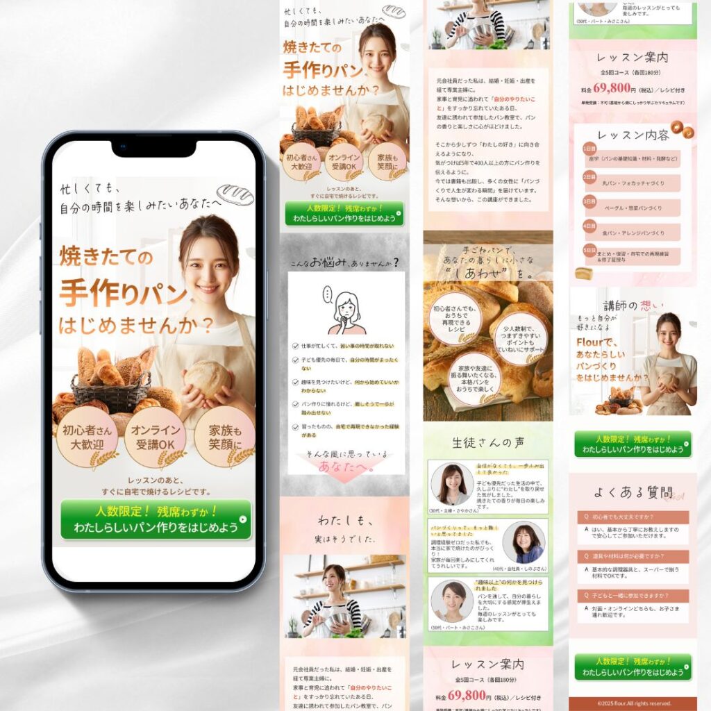 時間がない方でも挑戦してもらえるようなパン作り教室の生徒募集のLP。