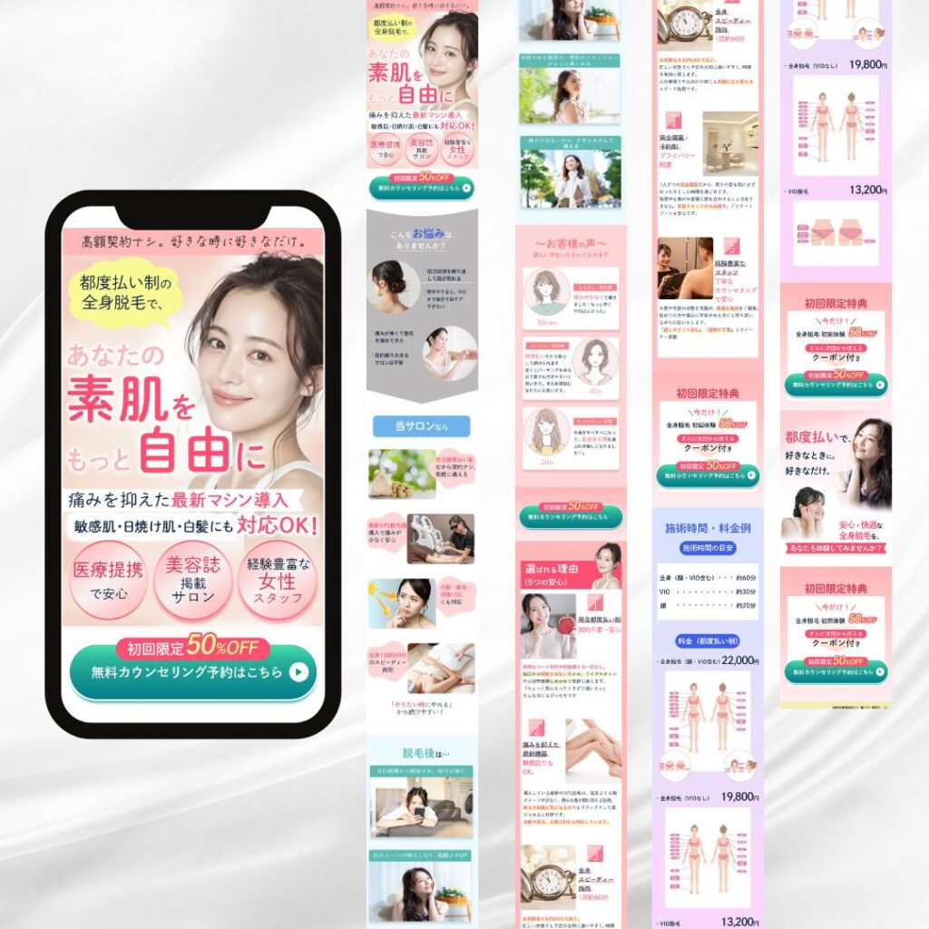 高額契約への不安がある若い女性に向けて、都度払い・痛みに配慮・初回50%OFFを打ち出し、気軽に試せる安心感を訴求する意図があります。