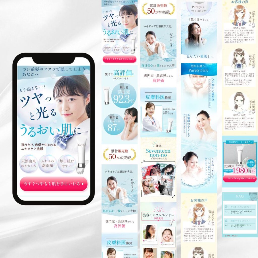 ニキビに悩む若い女性をターゲットに、スキンケア商品の魅力と安心感が伝わるLPとして制作しました。