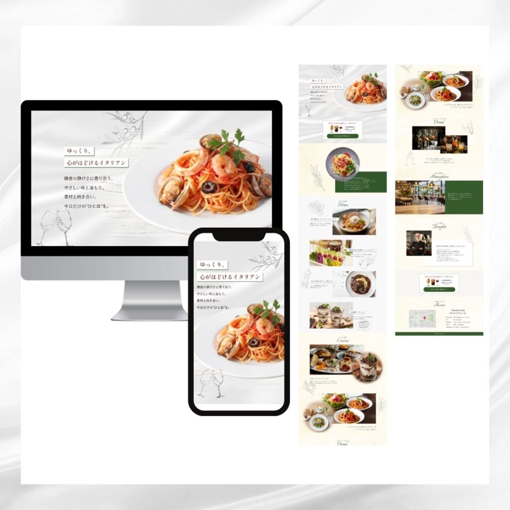 料理の写真を大きく配置し、視覚的に美味しさが伝わるようにするとともに、コースやメニュー、店内の雰囲気などを順番に紹介することで、来店イメージが自然に湧く構成にしました。